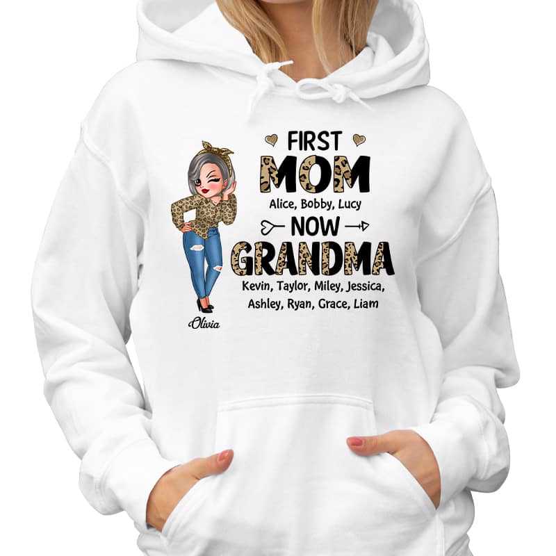 First Mom Now Grandma Leopard Sassy Woman Personalized Hoodie Sweatshirt