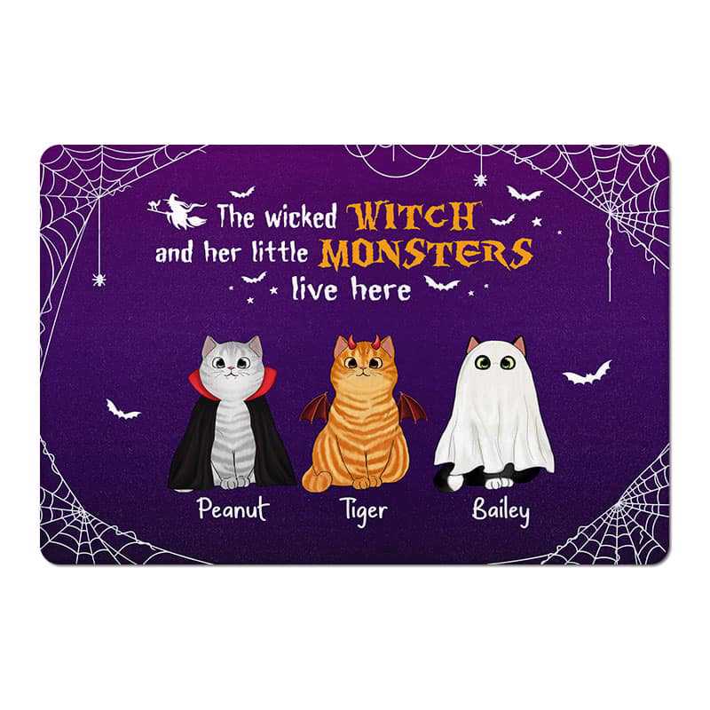 Halloween Wicked Witch & Little Monsters Sitting Fluffy Cat Personalized Doormat