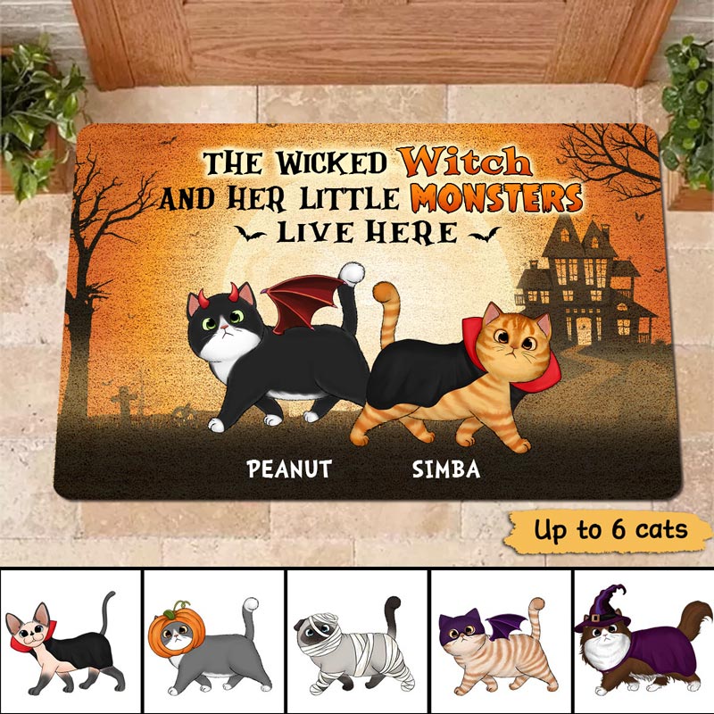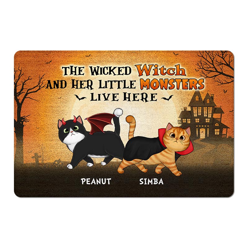 Halloween Wicked Witch And Walking Fluffy Cats Live Here Personalized Doormat